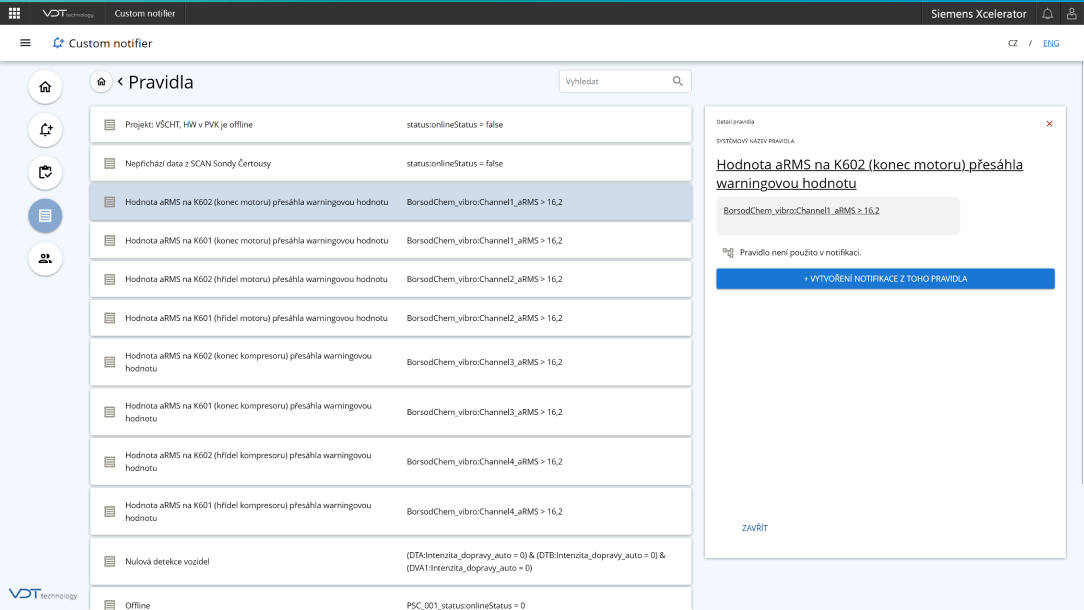 - •Možnost tvorby vlastních pravidel: Tvorba vlastních pravidel pro notifikace na základě specifických podmínek a parametrů, které odpovídají potřebám Vašeho provozu.