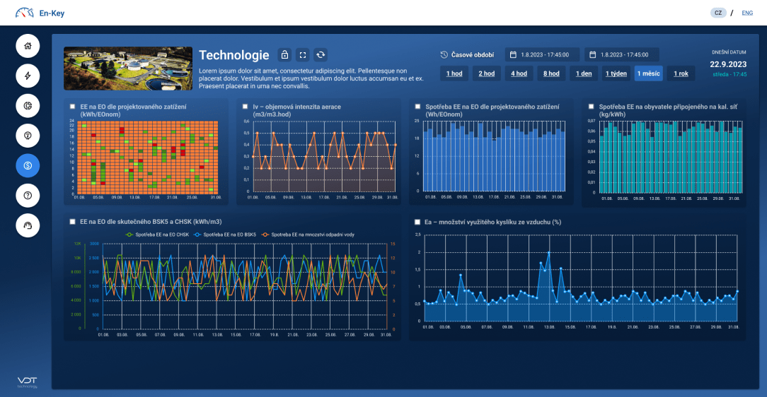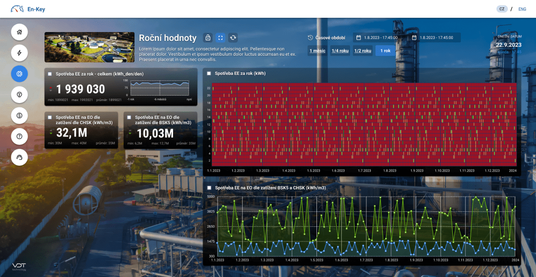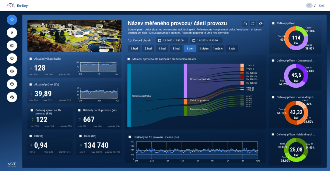 On-line monitoring spotřeby energií přináší možnost sledovat a vyhodnocovat energetickou náročnost jednotlivých činností i celých procesů. Díky přesnému přehledu o okamžitých i historických spotřebách energií se otevírá prostor pro detailní analýzu, která umožňuje identifikovat skryté úniky nebo zbytečné plýtvání. Tím lze optimalizovat provozní náklady a zlepšit celkovou účinnost. Energetické výkonnostní ukazatele (EnPI) jsou navíc vytvořeny specificky pro vodárenské provozy, přičemž splňují přísné normy a požadavky. Tento systém poskytuje provozovatelům neocenitelný nástroj pro zlepšení udržitelnosti, zajištění efektivity a snadnější dosažení stanovených cílů v oblasti energetického managementu.