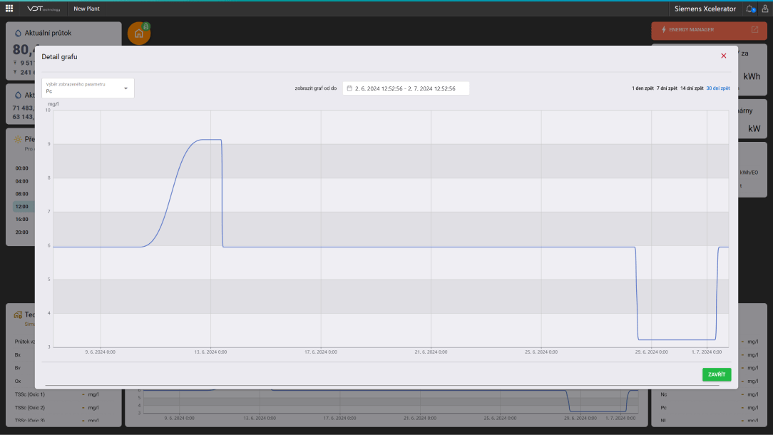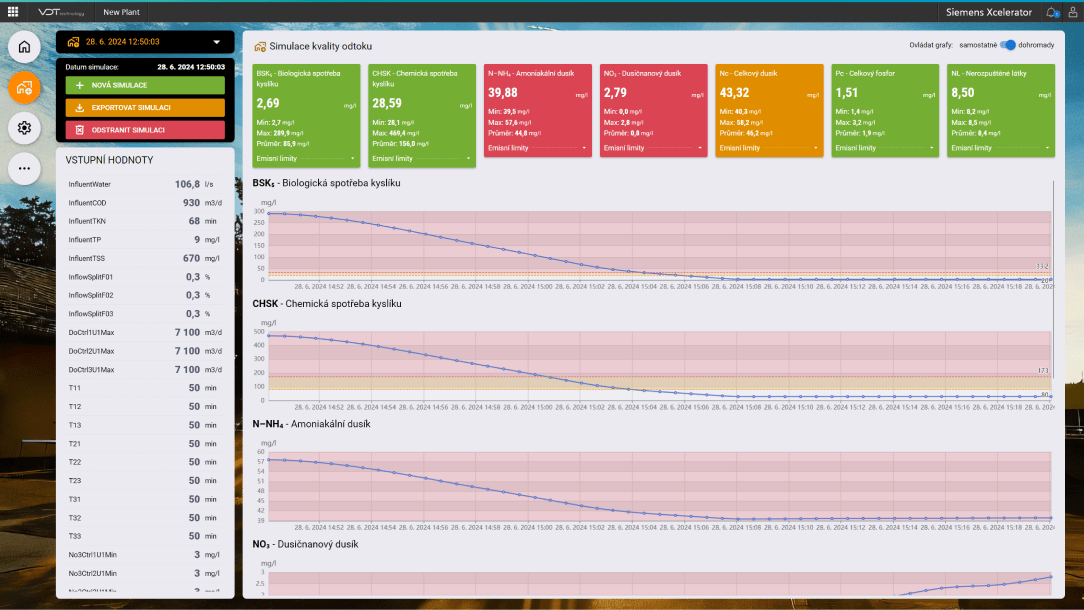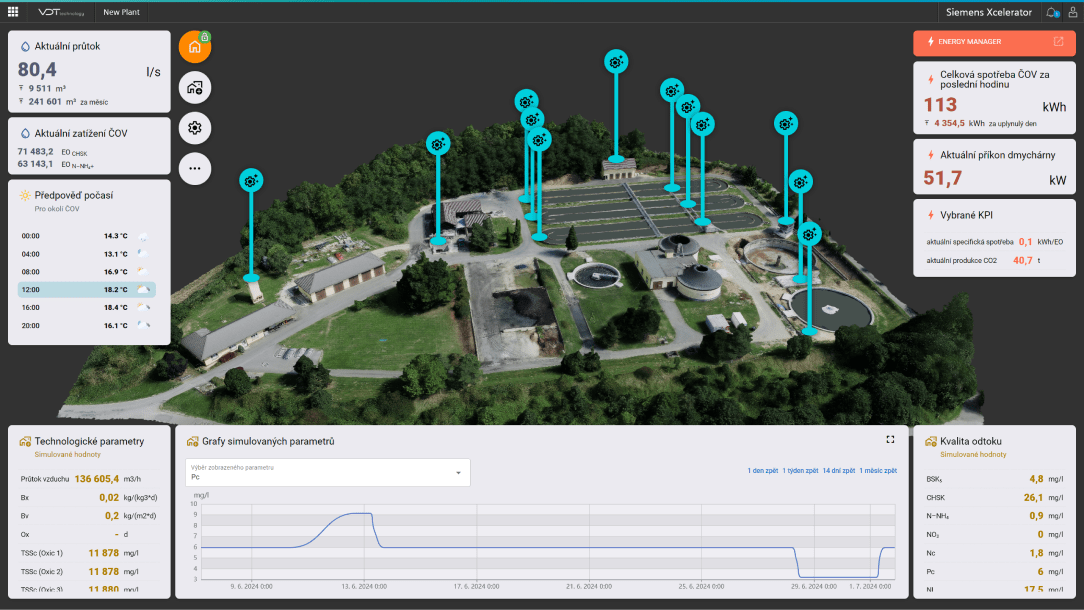 Moderní technologie umožňují provozovatelům čistírny odpadních vod získat přesný a detailní přehled o jejím aktuálním stavu a fungování. Virtuální 3D model, propojený s reálnými daty získanými přímo z provozu, poskytuje uživatelům vizuálně přehledný pohled na jednotlivé části zařízení.Online simulace provozu s výhledem na 24 hodin dopředu navíc umožňuje obsluze plánovat a připravovat se na potenciální výkyvy, zejména v oblasti látkového zatížení na odtoku. K dispozici jsou rovněž grafy naměřených hodnot s možností přístupu k historickým datům, což podporuje analýzu trendů, identifikaci problémů a optimalizaci procesů.