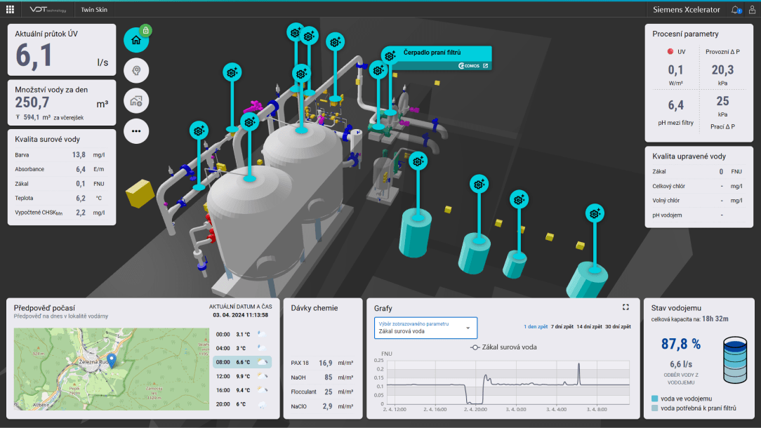 Aplikace nabízí praktický a efektivní nástroj pro správu a monitorování úpravny vody. Poskytuje detailní pohled na digitální dvojče úpravny vody a v reálném čase jej propojuje s aktuálními daty přímo z provozu.
