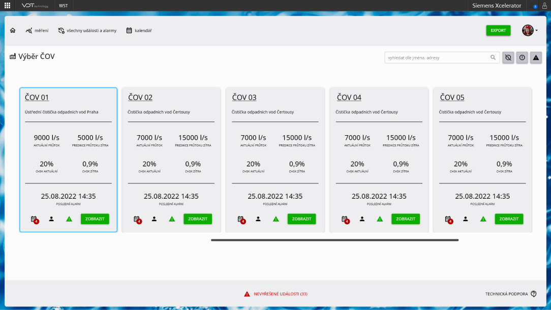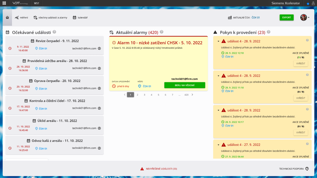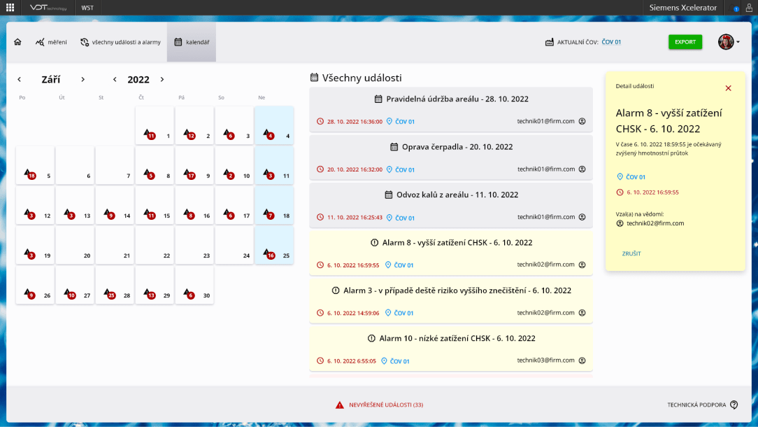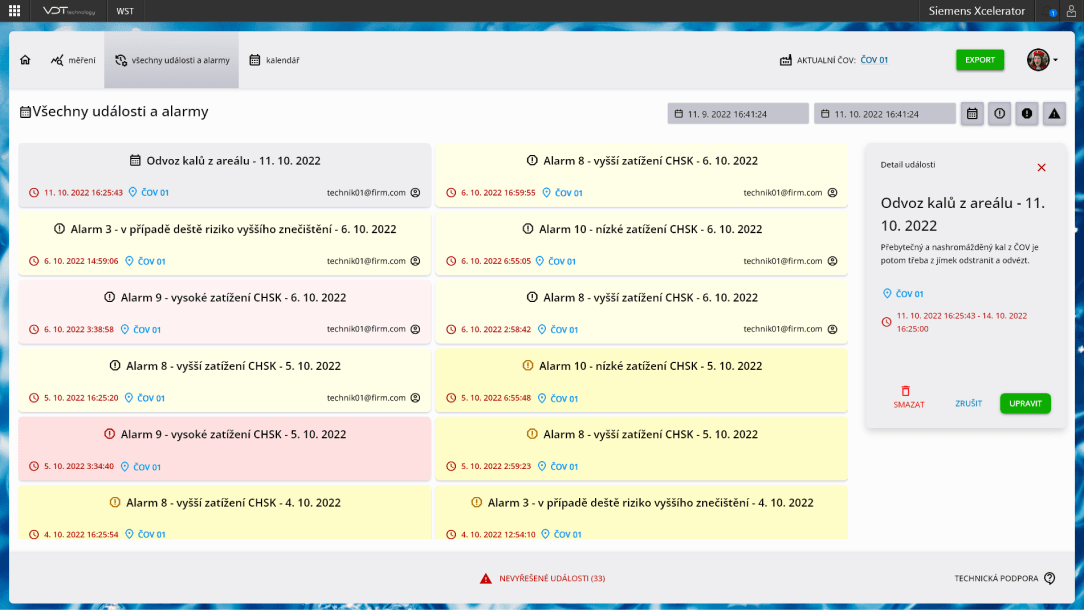 WST obsahuje integrovaný systém upozornění, který na základě definovaných alarmů informuje o rizikových situacích, například o vysokém látkovém zatížení po bezdeštném období. Tato funkcionalita umožňuje rychlou reakci na potenciální rizika a zajišťuje, že provoz je připraven na různé situace.- •Přehled plánovaných i neplánovaných událostí.